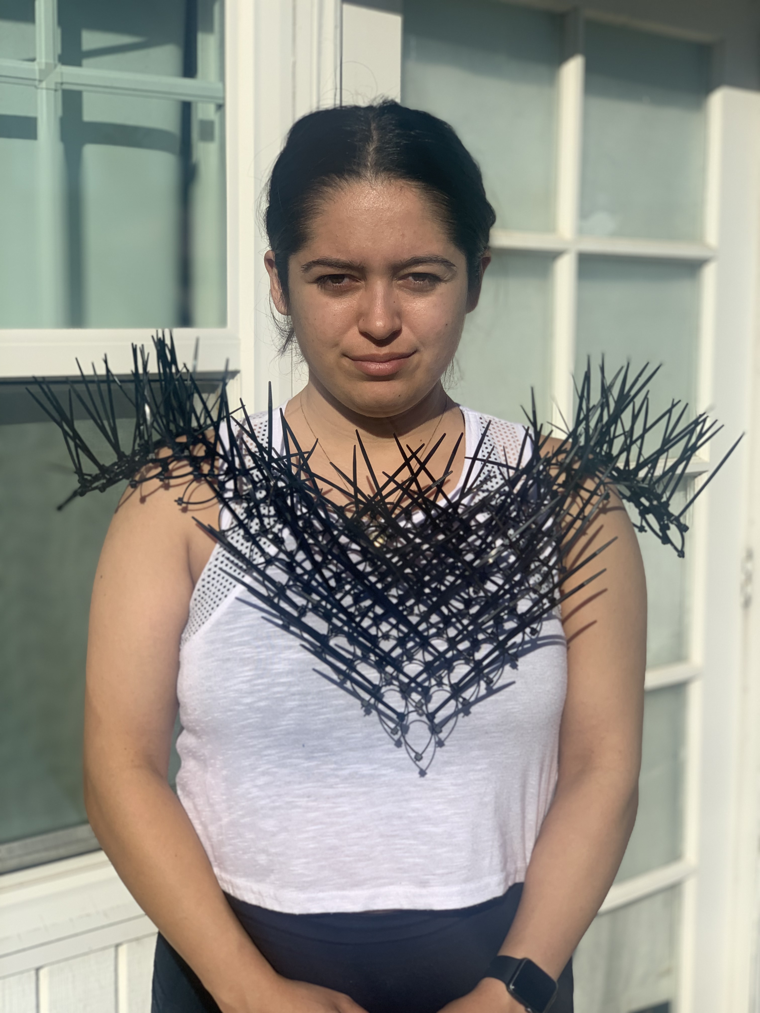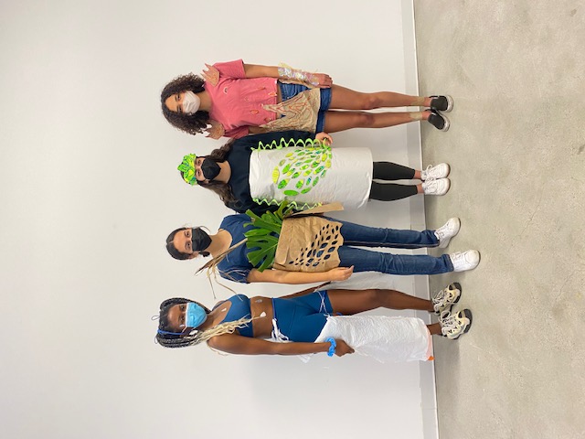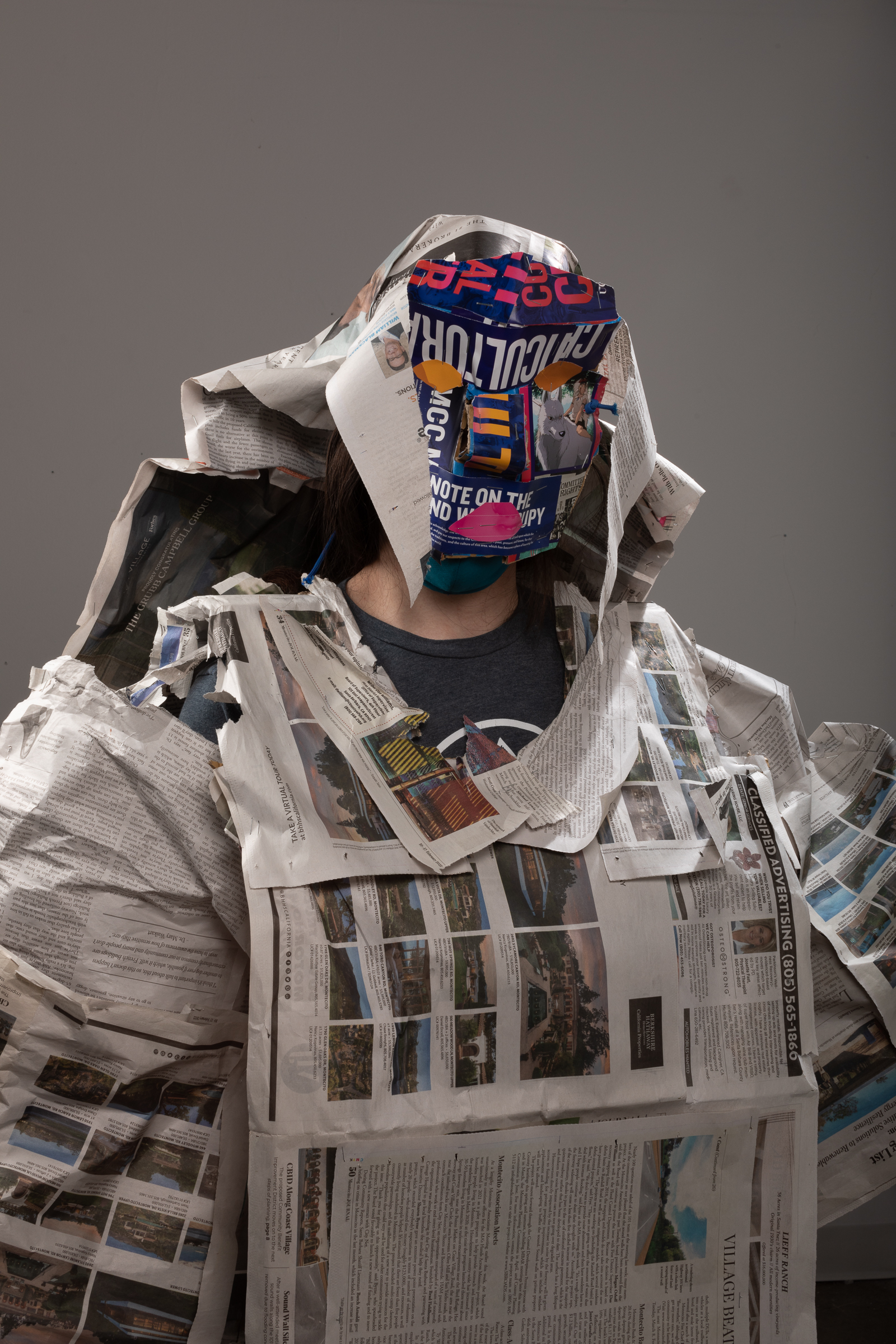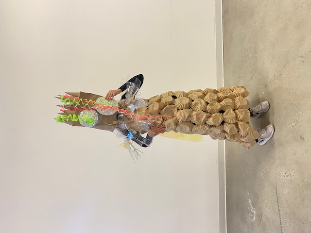 This exercise version of this prompt got students to work quickly with materials and build community with one another. Students are asked to produce a wearable sculpture that embodies the qualities of either Protection (armor, defense, comfort), Transformation (empowerment, sculpting the body), or Extension (new abilities, new senses). They were only allowed to use materials that were easily accessible (recycled, spare materials, or materials brought in to share) and had a week to create their wearble sculpture.